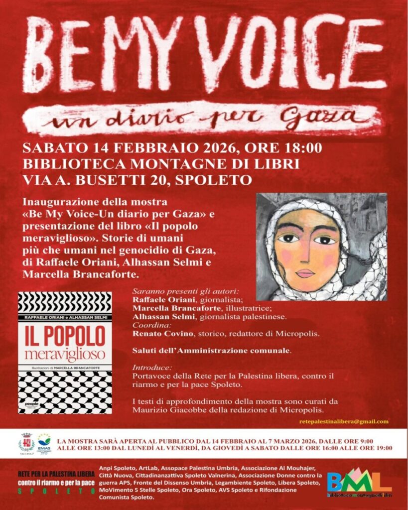 Raccontare ciò che la cronaca spesso tace, restituendo umanità a un popolo stretto nell’assedio. Con questo obiettivo la Rete per la Palestina libera contro il riarmo e per la pace di Spoleto ha portato a Spoleto il diario visivo di Alhassan Selmi e Marcella Brancaforte che dopo l’inaugurazione molto partecipata del 14 febbraio, prosegue fino al 7 marzo.
