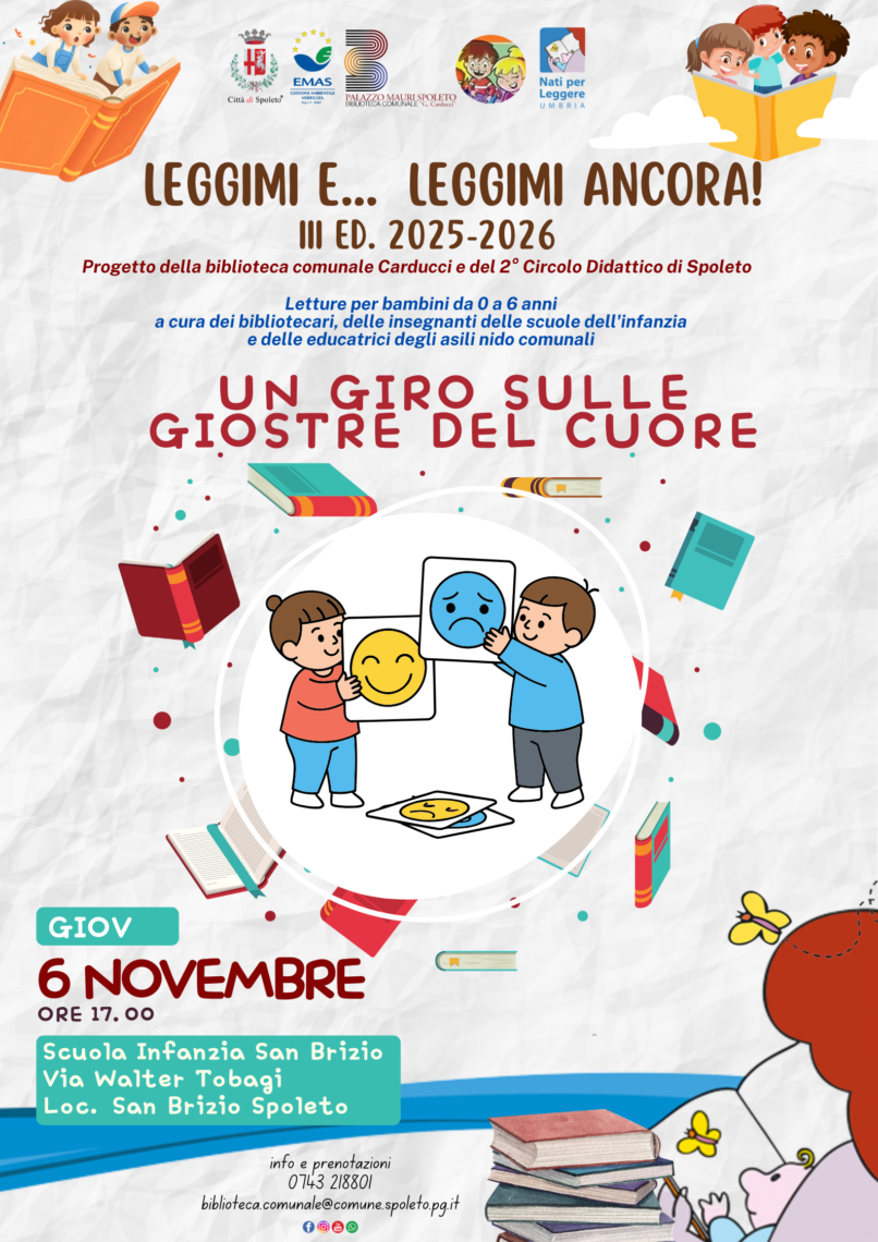 “Leggimi e… Leggimi ancora!“, giunto alla terza edizione, è un progetto di lettura ad alta voce per la fascia 0-6 anni, organizzato dalla Biblioteca comunale “G. Carducci” e dal 2° Circolo Didattico di Spoleto, partner del Patto locale della lettura e inserito nel Programma Nati per Leggere.