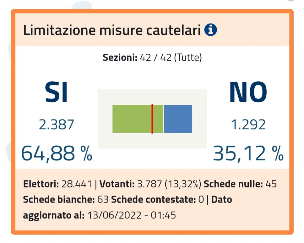 (DMN) Spoleto – questi i dati definitivi, diffusi dal Ministero dell’interno, riguardo gli scrutini dei 5 referendum abrogativi del 12 giugno 2022, relativo alle 42 sezioni elettorali del Comune di Spoleto: