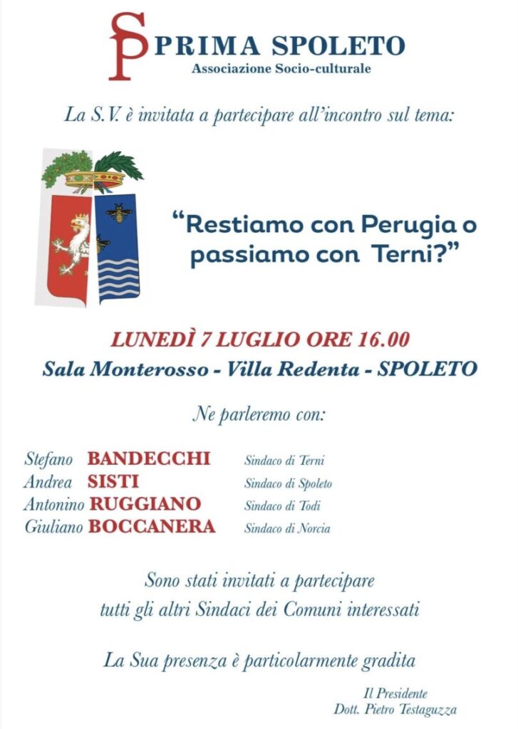 Nel rispetto delle finalità sociali, inizia l’attività operative dell’Associazione Prima Spoleto. Per il debutto si è scelto un tema che da decenni alimenta le discussioni e le fantasie di molti spoletini: restare con la provincia di Perugia o passare con quella di Terni? A tal proposito si sono costituiti, recentemente e nel passato, Comitati promotori e gruppi di interesse. Il tema, che affascina e divide, è stato rispolverato recentemente dal Sindaco di Terni, Stefano Bandecchi, che ha avanzato la proposta di passaggio di ben 14 comuni dalla provincia perugina a quella ternana. E sarà proprio Bandecchi uno dei relatori ufficiali dell’incontro che Prima Spoleto ha programmato per lunedì sette luglio, alle ore 16.00, nella sala Monterosso di Villa Redenta, aperto a tutta la cittadinanza. Insieme al primo cittadino di Terni, ci saranno i sindaci dei comuni demograficamente più significativi nei rispettivi comprensori, a partire da Andrea Sisti, sindaco di Spoleto, Antonino Ruggiano, sindaco di Todi e Giuliano Boccanera, sindaco di Norcia. Ovviamente sono stati invitati a partecipare tutti gli altri primi cittadini dei comuni interessati alla proposta. L’incontro, probabilmente il primo di una lunga serie, ritornerà certamente utile per iniziare a sondare le volontà delle singole municipalità. Un confronto poi che fornirà all’Associazione Prima Spoleto informazioni e materiale da utilizzare per ulteriori approfondimenti, con risultanze da mettere poi a disposizione della cittadinanza tutta. Anche perché, da notizie diffuse, si potrebbe arrivare ad un Referendum su questo quesito di appartenenza territoriale, vista l’esistenza di un apposito Comitato promotore che si sta muovendo in tal senso. Ma questo non rientra nei compiti e nelle finalità di Prima Spoleto.