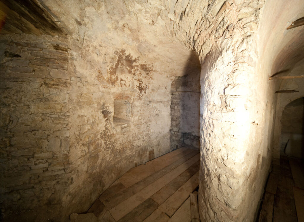 La storia. L’edificio che nel 1067, al tempo del vescovo Andrea, veniva definito “tribuna” fu identificato dal Sordini in un ambiente sottostante alla Cappella delle Reliquie che sporge dalla navata sinistra della Cattedrale di Spoleto in posizione corrispondente alla sesta campata. Si tratta di una cripta semi anulare. Il tipo, esistente già in età paleocristiana e la cui diffusione precede quella della cripta a oratorio, è noto per esempi numerosi soprattutto a Roma ma presenti anche in altri centri italiani, in Svizzera, in Germania, nel Belgio. La sua progettazione è in rapporto alla volontà di organizzare una particolare sistemazione delle reliquie del martire utilizzando lo spazio semicircolare sottostante all’abside: il corridoio assiale raggiungeva la cella con le reliquie, situato in modo che l’altare del presbiterio innalzato al di sopra sembrasse avere origine da essa; l’ambulacro consentiva un flusso ordinato dei fedeli, che scendendo dall’aula superiore potevano accedere ad una delle estremità, percorrere il corridoio semi anulare e risalire in chiesa dall’altra. Un esame di ciò che resta della decorazione pittorica della cripta e un confronto con analoghi esempi romani forniscono ulteriori elementi per orientare la datazione dell’insieme verso il secolo IX. L’iscrizione che vi si può ancora decifrare (ubi terribilis … percussit) lascia pochi dubbi che la zona superiore dell’ambulacro fosse destinata al racconto delle gesta di un martire. Per anni la cripta è stata chiusa e visibile dall’esterno solo per un tratto di pochi metri. (Fonte: L’Umbria, Manuali per il Territorio – Spoleto, di Lamberto Gentili, Luciano Giacché, Bernardino Ragni, Bruno Toscano).