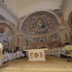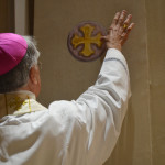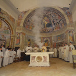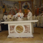 Al termine dell’omelia c’è stato il canto delle litanie dei Santi. Quindi il Vescovo ha proclamato la solenne preghiera di dedicazione, che esalta il mistero della Chiesa con le immagini della sposa vergine e madre, della vigna, del tempio e della città. Sono seguiti altri tre riti: l’unzione dell’altare e delle pareti, a ricordare che, come Cristo, anche i cristiani sono un popolo consacrato a Dio; l’incensazione dell’altare, del popolo e delle pareti, perché la chiesa è luogo della preghiera che sale al Padre come l’incenso profumato e perché l’assemblea liturgica è il tempio santo di Dio e quindi è avvolta dalla nuvola d’incenso in segno di onore; l’illuminazione a festa dell’altare e della chiesa, perché Cristo è la luce che risplende sul suo popolo e sul mondo intero. L’ultima parte della dedicazione è stata la liturgia eucaristica, il culmine dell’intera celebrazione, perché è l’Eucaristia che propriamente dedica la nuova chiesa, così come è l’Eucaristia che di domenica in domenica edifica e fa crescere il popolo cristiano. Infine dopo la comunione è inaugurata la cappella del Santissimo Sacramento con la reposizione dell’Eucaristia nel tabernacolo. Sono stati tanti e suggestivi i riti compiuti, ma al centro della dedicazione c’era la Chiesa in quanto popolo di Dio e il Cristo suo Signore. Dedicando la chiesa di mattoni, infatti, si ha una viva manifestazione della Chiesa di pietre vive e di Cristo pietra angolare, nel quale «tutta la  costruzione cresce ben ordinata per essere tempio santo nel Signore» (Ef 2,21).