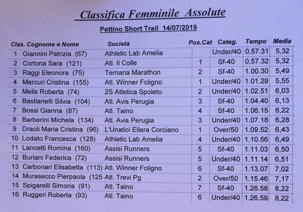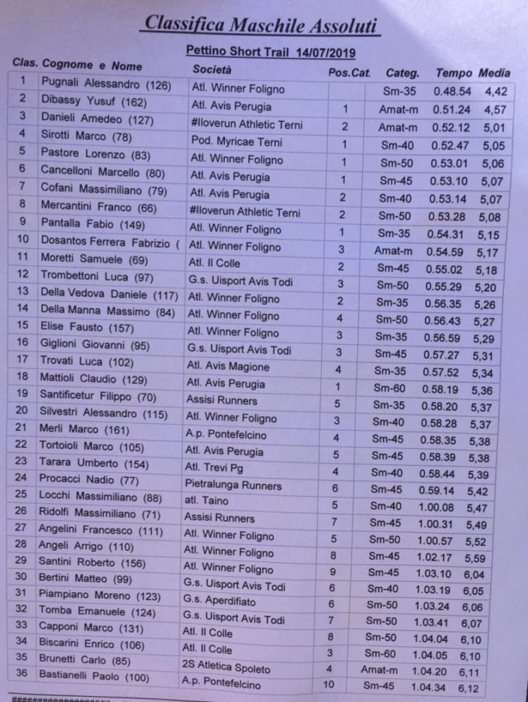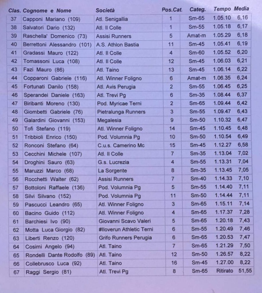 A tagliare per primo il traguardo, tra gli uomini, é stato Alessandro Pugnali dell’Atletica Winner Foligno con 00.48.54. Prima tra le donne Patrizia Giannini dell’Atletic Lab Amelia con 0.57.31.