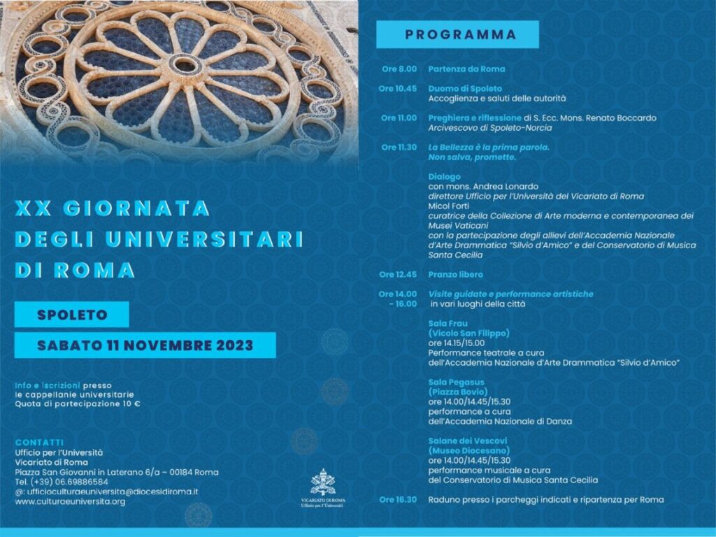 Sabato 11 novembre, l’Ufficio Cultura e Università del Vicariato di Roma organizza a Spoleto la XXesima Giornata degli Universitari di Roma: un momento di festa, condivisione, formazione e spiritualità con la partecipazione di oltre 1200 studenti provenienti dalle varie facoltà universitarie della Capitale. L’evento è realizzato in collaborazione con l’Archidiocesi di Spoleto-Norcia e patrocinato dal Comune di Spoleto.