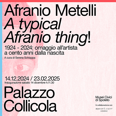 “Il programma del periodo invernale è articolato in una serie di progetti espositivi che testimoniano la molteplicità di linguaggi e attitudini dell’arte contemporanea” – commenta il direttore dei Musei Civici di Spoleto, Saverio Verini. “Questo ciclo di mostre, come del resto tutti gli altri finora, propone artisti legati al territorio e all’Umbria come Afranio Metelli e Nuvolo, la cui caratura è stata riconosciuta in Italia e anche all’estero; al loro fianco, ho scelto di invitare autori nel pieno della loro maturità artistica, che considero tra le voci più autorevoli e originali nell’ambito della scena contemporanea italiana e non solo, considerando che molti degli artisti hanno preso parte a importanti e prestigiose rassegne internazionali, a partire dalla Biennale di Venezia. Credo che da questa combinazione possa scaturire un dialogo intergenerazionale vitale e stimolante per il pubblico, al quale viene offerta una panoramica sui linguaggi dell’arte che va dagli anni Cinquanta fino a oggi. Oltre alle mostre, in tutto il periodo invernale e nei primi mesi del 2025 Palazzo Collicola sarà animato da incontri, presentazioni, visite guidate, approfondimenti, laboratori didattici: un programma che si estenderà anche alle altre sedi dei Musei Civici di Spoleto, andando a comporre un’offerta culturale e formativa rivolta ai residenti così come ai visitatori che vengono da fuori città”.