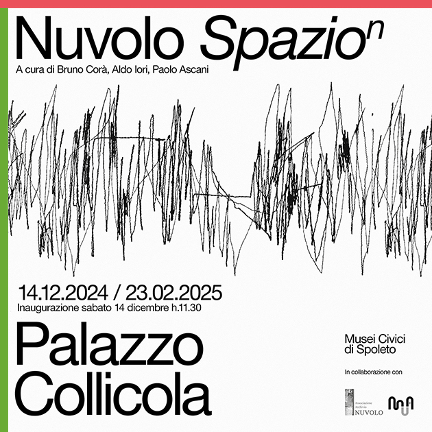 Il piano terra di Palazzo Collicola ospita Spazion, mostra personale dedicata all’artista umbro Nuvolo, curata da Bruno Corà, Aldo Iori e Paolo Ascani. Il progetto espositivo, realizzato in collaborazione con l’Associazione Archivio Nuvolo di Città di Castello, sottolinea la capacità di Nuvolo – all’anagrafe Giorgio Ascani (1926-2008) – di esplorare, attraverso la pittura, le diverse dimensioni dello spazio. Nel titolo della mostra, infatti, l’elevazione “alla ennesima” del termine “spazio” intende indicare la quantità di variazioni utilizzate dall’artista nelle sue opere, realizzate nel corso di una lunga carriera. L’esposizione offrirà al pubblico una visione d’insieme della produzione di Nuvolo, mettendo in luce la sua ricerca e la sua complessa identità artistica. Le opere in mostra provengono da importanti collezioni private e pubbliche, sia in Italia che all’estero, e dall’Archivio Nuvolo di Città di Castello, che fornisce anche parte del supporto logistico della mostra. L’esposizione, che anticipa le celebrazioni che nel 2026 accompagneranno i cento anni dalla nascita dell’artista, sarà corredata da schede critiche che illustreranno i vari cicli e da un catalogo con saggi dei curatori Bruno Corà, Aldo Iori, Paolo Ascani e di Saverio Verini.