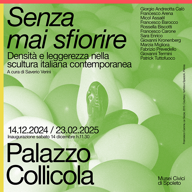 Il piano nobile di Palazzo Collicola accoglie Senza mai sfiorire. Densità e leggerezza nella scultura italiana contemporanea, mostra collettiva a cura del direttore dei Musei Civici di Spoleto, Saverio Verini. L’esposizione si inserisce in un filone di ricerca che, a partire dalla storica manifestazione Sculture nella città del 1962, a cura di Giovanni Carandente, ha visto Spoleto affermarsi come un imprescindibile punto di riferimento per la scultura contemporanea. Concentrandosi su una generazione di artisti nati negli anni Settanta, la mostra presenta al pubblico una selezione di opere che, attraverso l’esplorazione della materia e dello spazio, danno vita a un percorso espositivo capace di coniugare interpretazioni differenti del linguaggio scultoreo. L’allestimento, caratterizzato da un’opera per stanza, è pensato per valorizzare la singolarità di ogni lavoro e creare un dialogo intimo tra le opere e il Piano Nobile di Palazzo Collicola, sottolineando possibili corrispondenze tra i lavori degli artisti e gli ambienti che li accolgono. Il dato anagrafico, insieme alla riflessione sulla dimensione plastica, non si configura come unico elemento distintivo. Tutte le opere esposte, infatti, sembrano condividere una specifica tensione interna, come evidenzia il sottotitolo della mostra, “Densità e leggerezza nella scultura italiana contemporanea”: in ogni lavoro coesistono richiami alla tradizione ed elementi che sembrano contraddirla, senso di gravità e leggerezza, resistenza/durata e carattere effimero. Il progetto espositivo si pone in continuità con la mostra La sostanza agitata, ospitata nell’estate del 2023 al piano terra di Palazzo Collicola, che ha proposto un’indagine sulla scultura contemporanea in Italia attraverso le opere di artisti under 35. Senza mai sfiorire vede la partecipazione di: Giorgio Andreotta Calò, Francesco Arena, Micol Assaël, Francesco Barocco, Rossella Biscotti, Francesco Carone, Sara Enrico, Giovanni Kronenberg, Marzia Migliora, Fabrizio Prevedello, Giovanni Termini, Patrick Tuttofuoco.