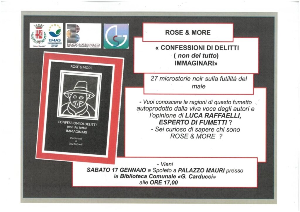 Sabato 17 Gennaio a Palazzo Mauri, Biblioteca Comunale “G. Carducci“ verrà presentato al pubblico un libro a fumetti autoprodotto dagli autori che si firmano ROSE & MORE. Il fumetto si intitola “Confessioni di delitti (non del tutto) immaginari”. Si tratta, come si legge nell’invito/presentazione, di 27 micro-storie noir sulla futilità de male.