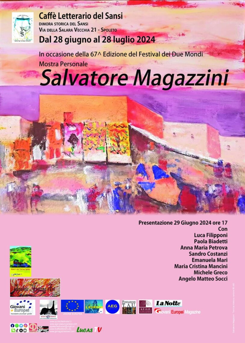 Salvatore Magazzini presenterà la sua mostra personale al caffè letterario del sansi a Spoleto sabato 29 giugno alle ore 17 alla presenza dello stesso artista che presenta opere inedite di cui quella che darà la copertina al magazine La Fiera letteraria (di cui in locandina). La mostra a cura di Luca Filipponi e Paola Biadetti resterà aperta fino al 28 luglio e sabato sarà presentata anche ai media e critici presenti : Luca Filipponi, Paola Biadetti, Sandro Costanzi, Emanuela Mari, Michele Greco,