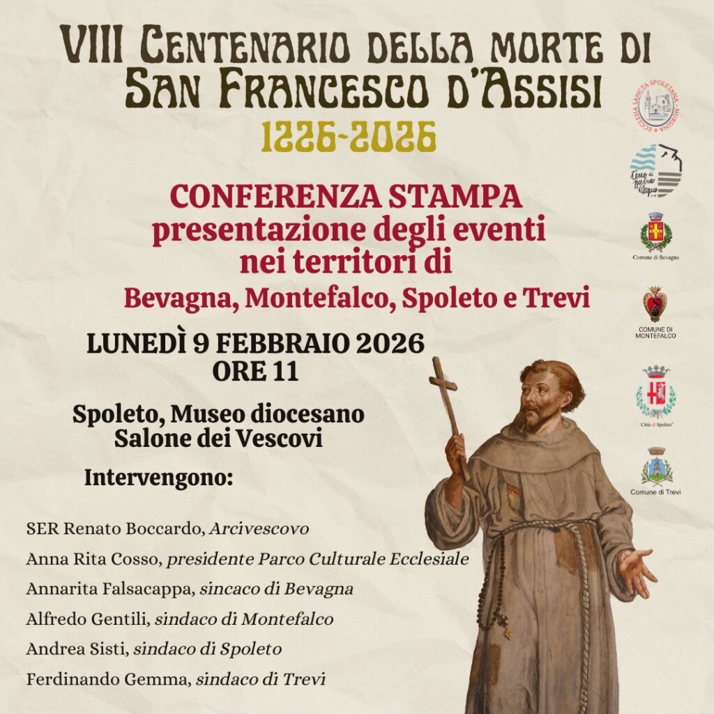 In vista dell’VIII centenario della morte di San Francesco d’Assisi (1226-2026), Bevagna, Montefalco, Spoleto e Trevi hanno costruito insieme un articolato programma di iniziative per celebrare la figura del Santo e il suo profondo legame con questi territori, tutti appartenenti all’Archidiocesi di Spoleto-Norcia.