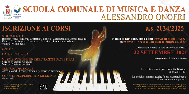 Per iscriversi ai corsi è necessario compilare il modulo online reperibile nel sito istituzionale dell’Ente www.comune.spoleto.pg.it nella pagina dedicata alla Scuola comunale nella sezione “Servizi” (https://shorturl.at/N29Yi).