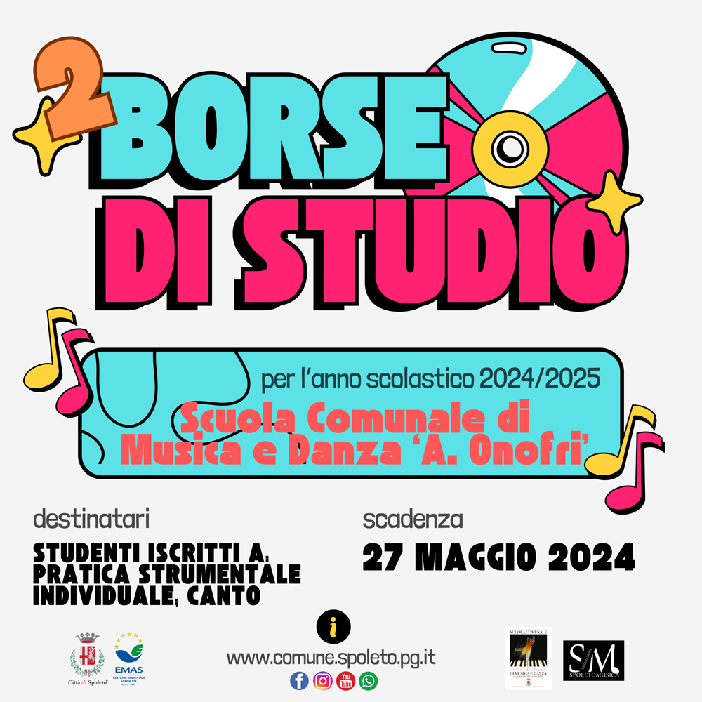 È stato pubblicato il bando per la concessione di due borse di studio per l’anno scolastico 2024/2025 – https://shorturl.at/gx158 – rivolte agli allievi regolarmente iscritti alla Scuola Comunale di Musica e Danza “Alessandro Onofri” nell’anno scolastico 2023/2024.