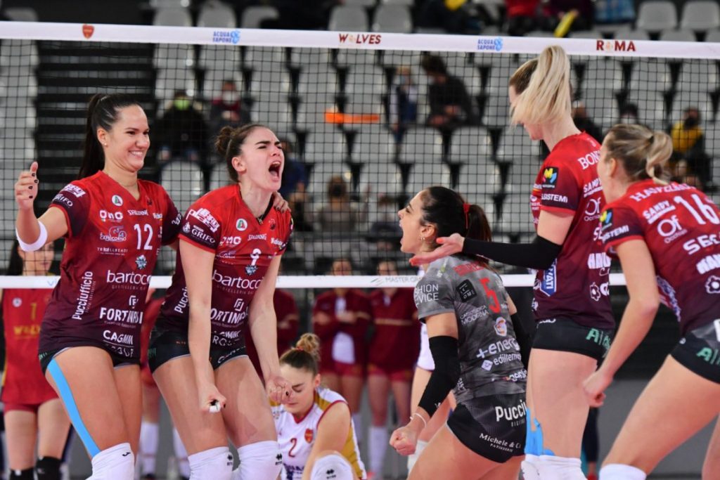 La Bartoccini-Fortinfissi Perugia espugna il Palazzetto dello Sport di Roma, le “gladiatrici” umbre cedono nel primo set ma poi si riprendono ed ottengono i tre punti con un 3-1 (25-17 29-31 19-25 22-25 i parziali) conquistato fra tante difficoltà, come l’assenza di un opposto in rosa e le defezioni di Guiducci e Nwakalor, quest’ultima tenuta a riposo in via precauzionale a seguito di una distorsione rimediata in settimana.