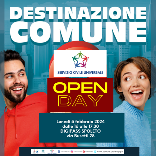 Dalle ore 16.00 alle 17.30 gli interessati potranno recarsi nella sede del Digipass Spoleto, in via Busetti 28, per avere informazioni sui cinque progetti nelle aree educazione, cultura, protezione civile ed ambiente che il Comune di Spoleto ha attivato per impiegare dodici volontari, di cui cinque Giovani con Minori Opportunità (GMO) presso l’Ufficio IAT, la Biblioteca comunale “Giosuè Carducci”, il Museo Carandente, la sede della protezione civile e l’Ufficio Ambiente.