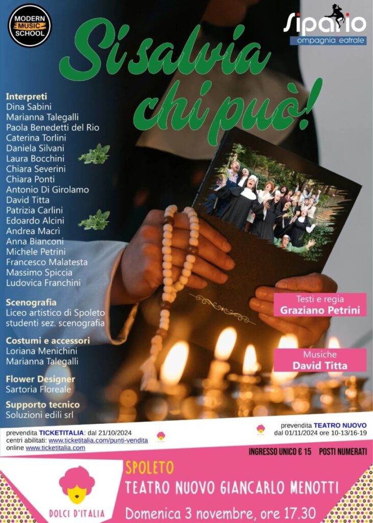 Il Teatro Nuovo “G. Carlo Menotti” di Spoleto è pronto ad accogliere una nuova e frizzante commedia che promette di far ridere e riflettere il pubblico: “Si Salvia Chi Può”. Scritta e diretta da Graziano Petrini, si preannuncia come uno degli eventi più attesi della stagione, scelto, anche quest’anno, come spettacolo di chiusura del Festival dei Dolci d’Italia.