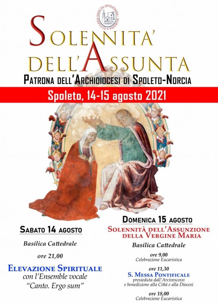L’Assunta, insieme a S. Ponziano e S. Benedetto, è patrona dell’archidiocesi di Spoleto-Norcia e ad essa è dedicata la Basilica Cattedrale di Spoleto, così come molte altre chiese parrocchiali presenti sul territorio. A causa delle limitazioni che caratterizzano lo stato di emergenza nazionale causato dalla pandemia da Covid-19 non si terrà, per il secondo anno consecutivo, la tradizionale processione con la Santissima Icone dalla Basilica di S. Gregorio a quella Cattedrale. E allora sabato 14 agosto 2021 alle ore 21.00 in Duomo ci sarà un’elevazione spirituale con l’Ensamble vocale “Canto. Ergo sum”. Domenica 15 agosto, invece, ci saranno tre celebrazioni eucaristiche in Cattedrale: alle 9.00, alle 11.30 il solenne pontificale presieduto dall’arcivescovo di Spoleto-Norcia mons. Renato Boccardo con al termine benedizione alla Città e alla Diocesi dalla loggia centrale del Duomo e alle 18.00. Il Presule, poi, alle 18.30 celebrerà la Messa dell’Assunta a S. Pellegrino di Norcia.