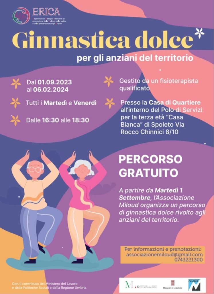 Comincerà venerdì 1 settembre il percorso di “Ginnastica dolce” rivolto agli anziani del territorio presso la Casa di Quartiere della Casa Bianca. Grazie al progetto ERICA (Esperienze in rete per Interventi di promozione della Cultura della Salute e della Prevenzione degli Anziani) finanziato dal Ministero del Lavoro e delle Politiche Sociali e dalla Regione Umbria le AssociazioniMiloud e I Miei Tempi propongono attività rivolte agli anziani e, in particolare in questo caso, l’associazione Miloud dà il via ad un percorso gratuito di ginnastica dolce gestito da un fisioterapista qualificato. Gli incontri, completamente gratuiti, inizieranno il 1° settembre fino al 6 febbraio e si terranno il martedì e il venerdì pomeriggio dalle 16,30 alle 18,30. È necessaria la prenotazione al numero 0743221300