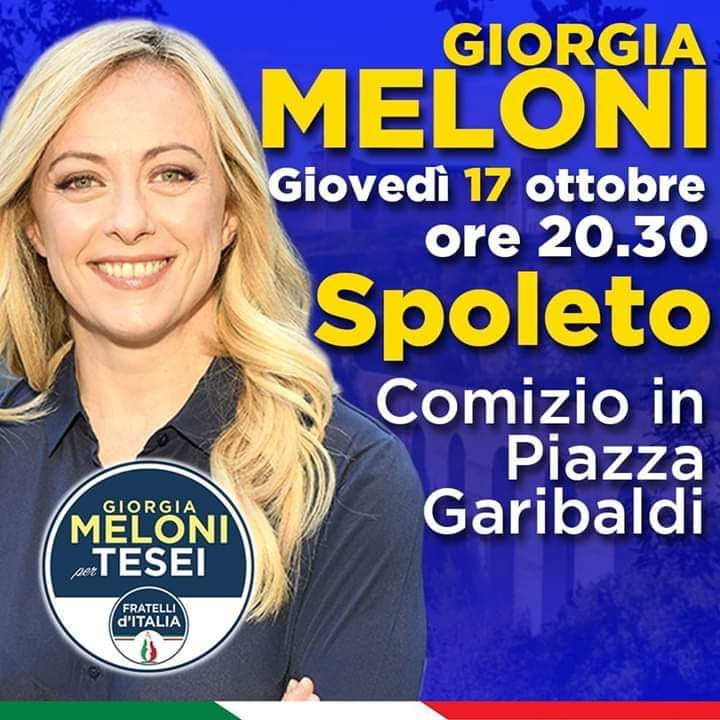 (DMN) Spoleto – la città del Festival si prepara alle prossime elezioni regionali. A sostegno della candidatura a presidente della Regione della Senatrice Donatella Tesei, dopo il leader della Lega Matteo Salvini che é stato in città tra domenica e lunedì, giungerà a Spoleto anche l’Onorevole Giorgia Meloni, presidente di Fratelli d’Italia.