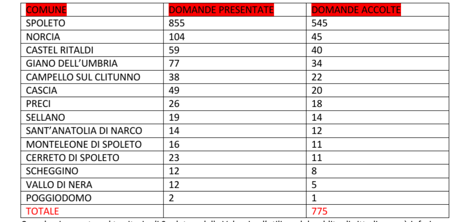 Alleghiamo la tabella relativa a tutti i comuni dello Spoletino e della Valnerina, facendo riferimento alle domande presentate e a quelle accolte.