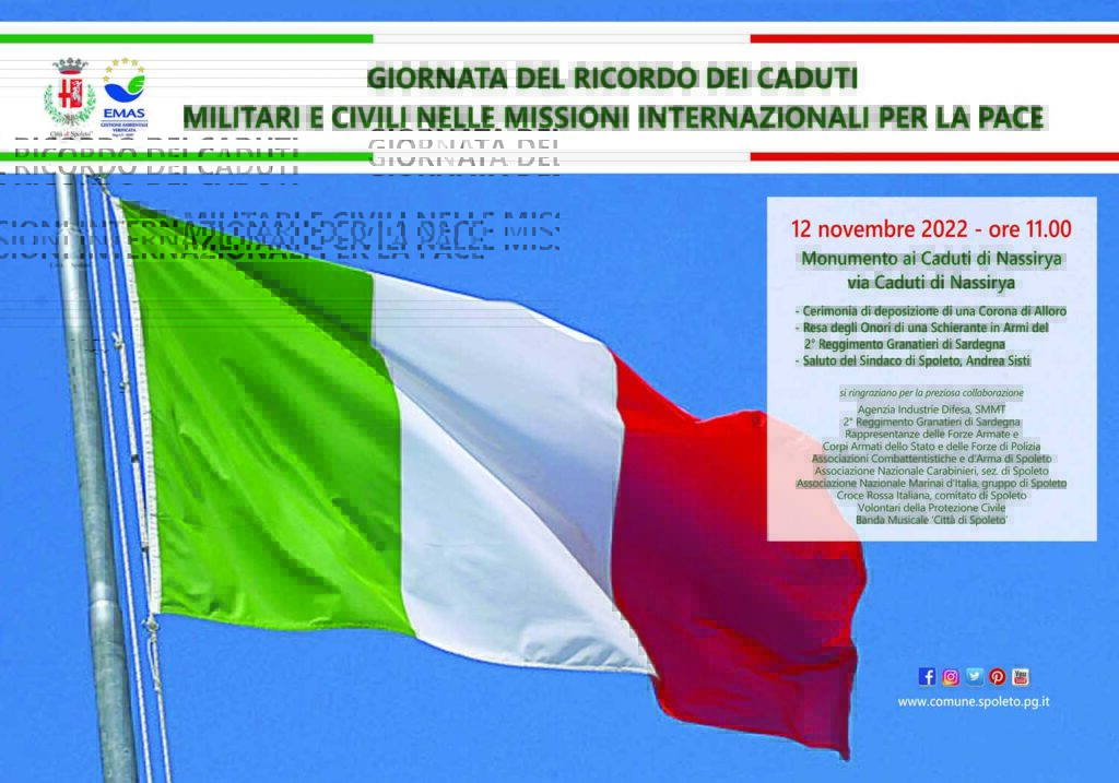Sabato 12 novembre verrà celebrata a Spoleto la “Giornata del ricordo dei Caduti militari e civili nelle missioni internazionali per la pace”, istituita con legge 12 novembre 2009, n. 162.