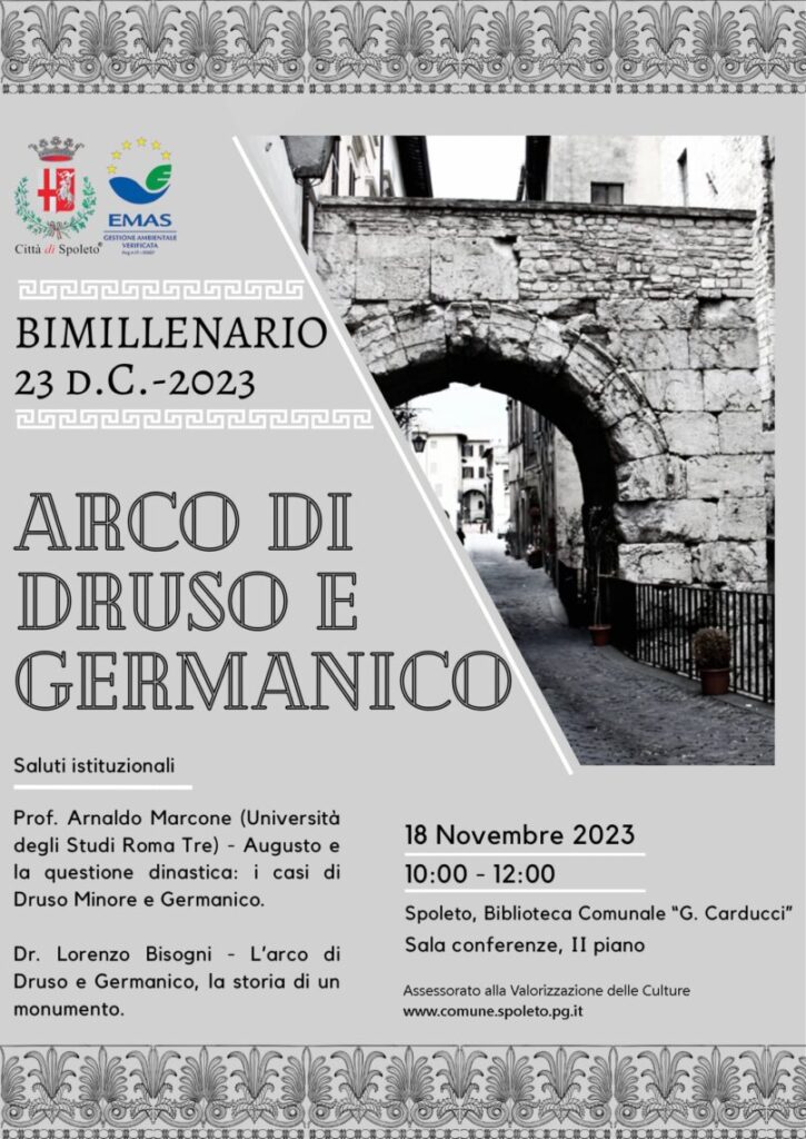 Sabato 18 novembre dalle ore 10.00 alle ore 12.00 nella Sala Conferenze al II piano di Palazzo Mauri, sede della Biblioteca comunale di Spoleto ‘G. Carducci’, si terranno le celebrazioni per il bimillenario dell’Arco di Druso e Germanico.