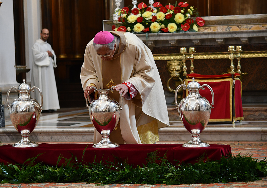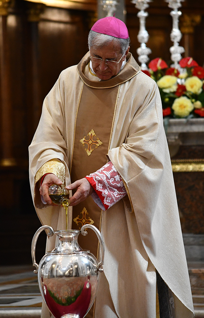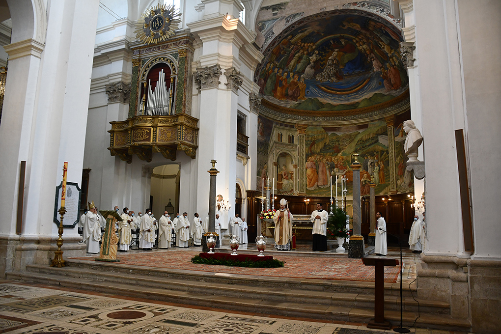 La mattina di sabato 30 maggio 2020 nella Basilica Cattedrale di Spoleto l’arcivescovo Renato Boccardo ha presieduto la Messa Crismale, che si sarebbe dovuta tenere il 9 aprile scorso, rinviata dopo la chiusura totale dell’Italia a causa del Covid-19. Erano presenti tutti i presbiteri della Diocesi a significare l’unità della Chiesa locale raccolta intorno al proprio Vescovo. Presente il vescovo emerito di Orvieto-Todi mons. Giovanni Scanavino, che vive nel convento degli agostiniani di Cascia. In questa Messa sono stati consacrati gli Oli Santi: il Crisma, l’Olio dei Catecumeni e l’Olio degli Infermi. Tutti i sacerdoti, poi, hanno rinnovato le promesse fatte nel giorno dell’ordinazione. Si è trattato della prima Messa che mons. Boccardo ha celebrato nel Duomo dal giorno (18 maggio, ndr) in cui è stato possibile tornare a vivere l’eucaristica con i fedeli. A causa della ridotta capienza della Cattedrale per il “distanziamento sociale”, sono state accolte solo un centinaio di persone, che hanno occupato i posti indicati sui banchi; non c’è stata la distribuzione degli Olii al termine della celebrazione (essi verranno recapitati nella settimana seguente ai Pievani, che li faranno pervenire ai Parroci della propria Pievania; la Messa è stata trasmessa in diretta sulla pagina Facebook (SpoletoNorcia) e sul canale YouTube (Archidiocesi Spoleto Norcia) della Diocesi.