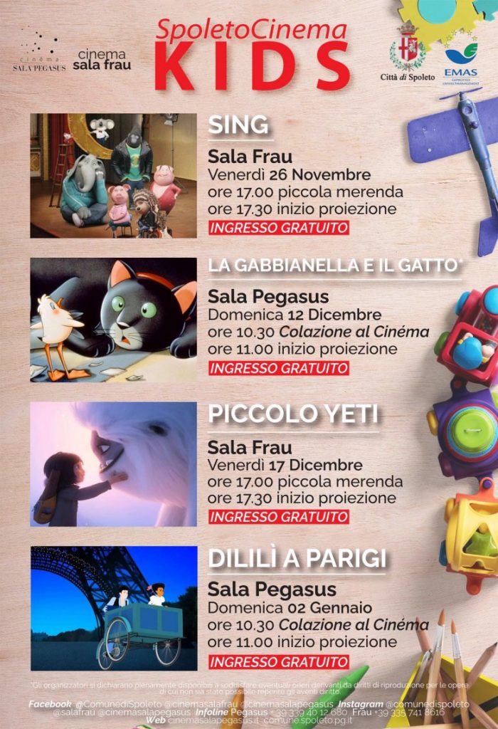 Accrescere l’interesse dei bambini nei confronti del cinema. È questo lo scopo di ‘Spoleto Cinema Kids’, l’iniziativa del Comune di Spoleto realizzata in collaborazione con il Cinema Sala Frau e il Cinema Sala Pegasus, che dal 26 novembre al 2 gennaio propone un calendario di appuntamenti dedicati ai più piccoli.