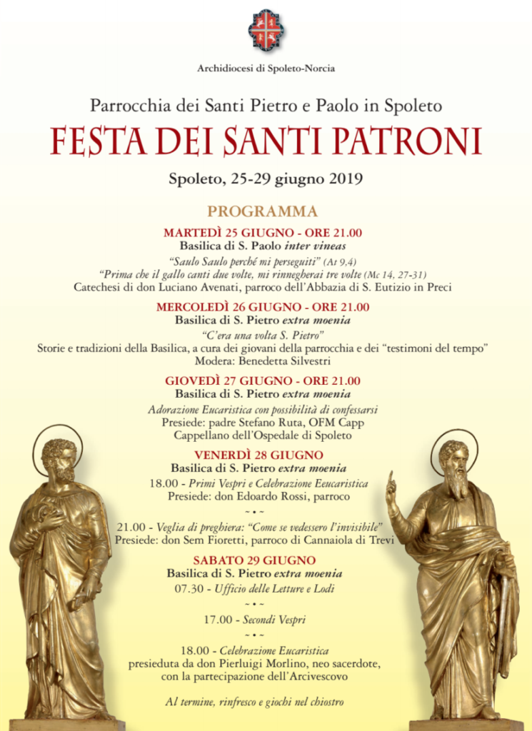 (DMN) Spoleto – La parrocchia dei Santi Pietro e Paolo, guidata da don Edoardo Rossi, si appresta a celebrare la festa dei Santi Patroni. Le celebrazioni inizieranno martedì 25 giugno e culmineranno il 29 con la santa messa celebrata dal neo sacerdote don Pierluigi Morlino.