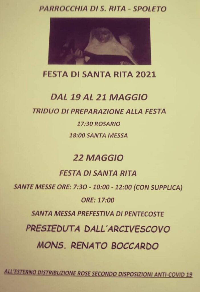 (DMN) Spoleto – la comunità parrocchiale di Santa Rita e tutta la città, si apprestano a celebrare, il prossimo 22 maggio, la festa della Santa degli Impossibili. Come tradizione, nella parrocchia spoletina, guidata dai Padri Agostiniani Scalzi, saranno numerosi gli appuntamenti di preghiera in onore della Santa di Cascia.