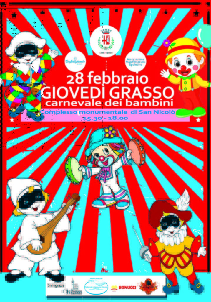 Inserito tra i festeggiamenti del 191° Carnevale di Spoleto, è in programma il 28 febbraio, giovedì grasso, al Complesso Monumentale di San Nicolò, dalle ore 15.30 alle ore 18, il Carnevale dei Bambini, un’iniziativa dedicata alle famiglie, fatta di giocolieri e di animazioni, di giocattoli di legno e bolle di sapone, con lancio di stelle filanti e palloncini. L’uso di bombolette spray non è autorizzato all’interno del Complesso di San Nicolò.