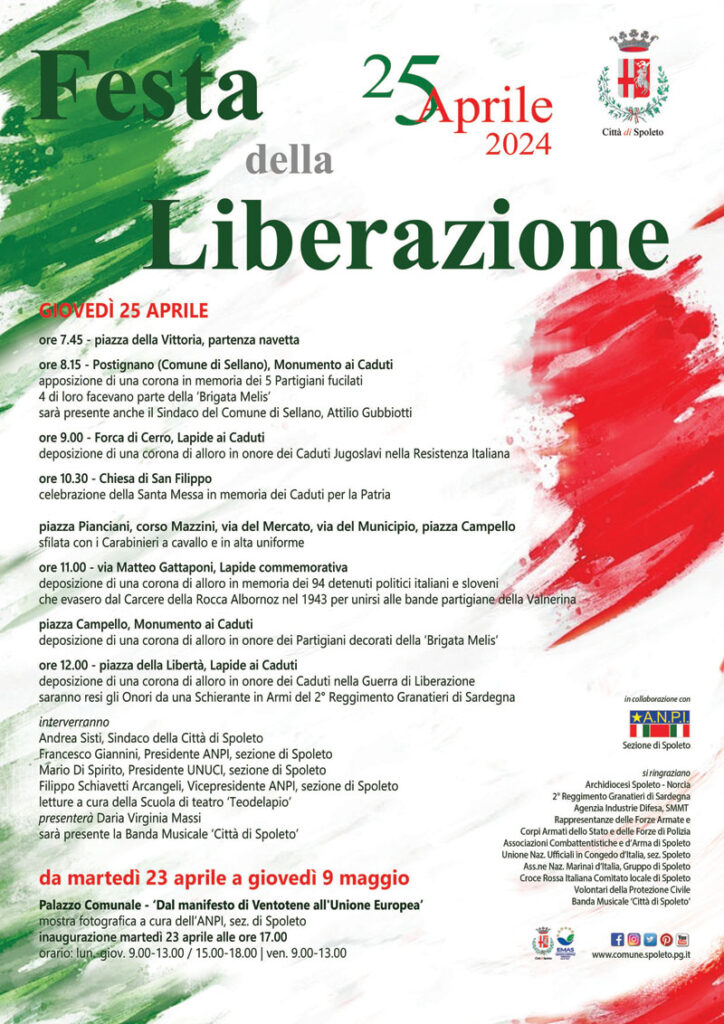 Celebrazioni istituzionali e una mostra fotografica per celebrare il 79° anniversario della liberazione d’Italia dall’occupazione nazista e dal regime fascista organizzati dal Comune di Spoleto in collaborazione con l’Associazione Nazionale Partigiani d’Italia – Sezione Spoleto.