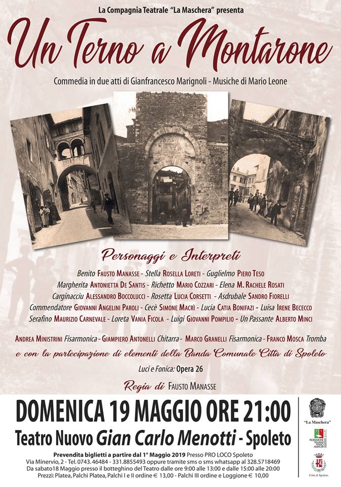 La compagnia Teatrale La Maschera porterà in scena, domenica 19 maggio, alle ore 21, al Teatro Nuovo Gian Carlo Menotti una delle sue storiche commedie musicali “Un Terno a Montarone”. La commedia in due atti di Gian Francesco Marignoli, musicata da Mario Leone, verrà diretta dal regista e attore Fausto Manasse. Allo spettacolo prenderà parte la Banda Comunale Città di Spoleto.