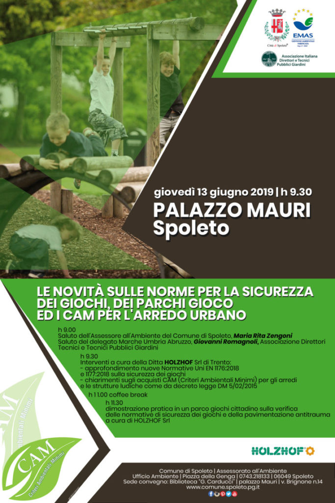 Il convegno prevede alle ore 9.00 il saluto dell’Assessore all’Ambiente del Comune di Spoleto Maria Rita Zengoni e del delegato regionale dell’associazione Direttori Tecnici e Tecnici Pubblici Giardini Giovanni Romagnoli. Alle ore 9.30 gli interventi a cura della ditta HOLZHOF di Trento con approfondimento sulle nuove normative Uni EN 1176.2018 e 1177:2018 sulla sicurezza dei giochi e chiarimenti sugli acquisti CAM per gli arredi e le strutture ludiche come da legge DM 5/02 /2015.