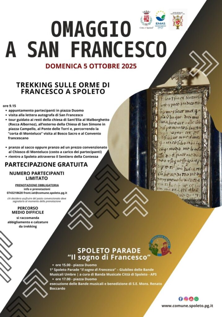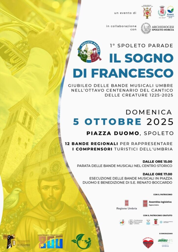Alle ore 15.00, inoltre, in piazza Duomo è in programma la 1a Spoleto Parade “Il sogno di Francesco”, Giubileo delle Bande Musicali Umbre, una parata organizzata dalla Banda Musicale Città di Spoleto – APS e alle ore 17.00 si terrà l’esecuzione di brani da parte delle Bande musicali con la benedizione di S. E. Mons. Renato Boccardo.