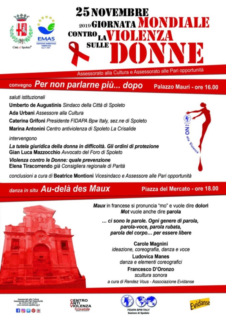 Un convegno, una performance di danza e la fontana di Piazza del Mercato illuminata di rosso: queste le iniziative che il Comune di Spoleto e FIDAPA BPW Italy sezione di Spoleto, Centro Antiviolenza Crisalide e Associazione Evidanse, hanno organizzato, lunedì 25 novembre, per celebrare la Giornata Internazionale contro la Violenza sulle Donne.