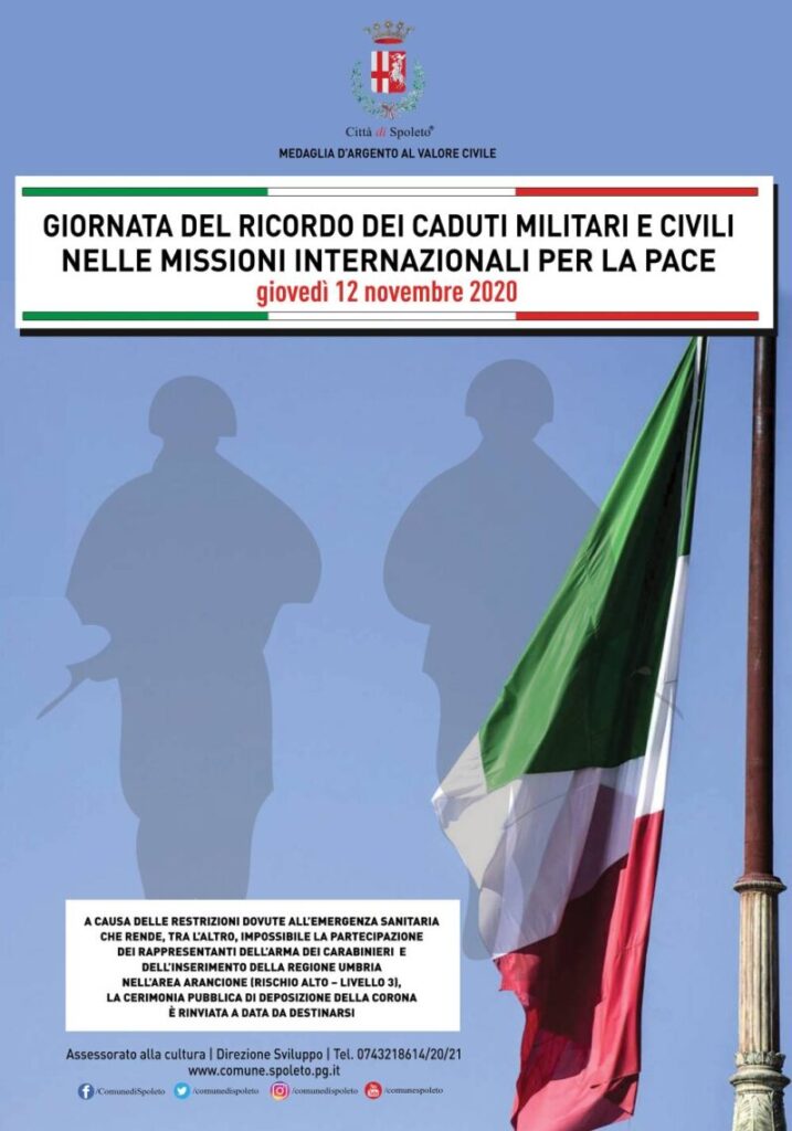 La “Giornata del ricordo dei Caduti militari e civili nelle missioni internazionali per la pace”, istituita con legge 12 novembre 2009, n. 162. Il 12 novembre è anche la ricorrenza del 17° anniversario dell’attentato di Nassiriya, avvenuto nel novembre 2003, in cui morirono 19 italiani e 9 iracheni. Tra gli italiani persero la vita dodici Carabinieri, cinque militari dell’Esercito e due civili.