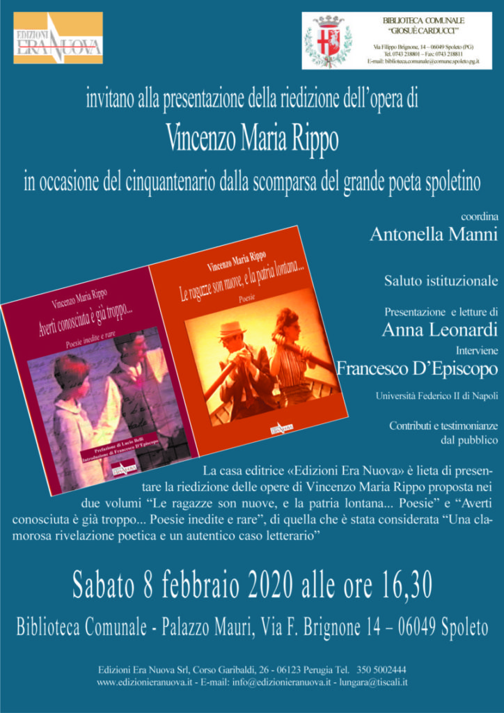 A distanza di 50 anni dalla scomparsa del poeta Vincenzo Maria Rippo, la città di Spoleto ha la possibilità di ricordarne la figura e l’opera grazie all’evento programmato per le ore 16,30 di sabato 8 febbraio 2020 presso la Biblioteca Comunale Giosuè Carducci (via Brignone, 14).