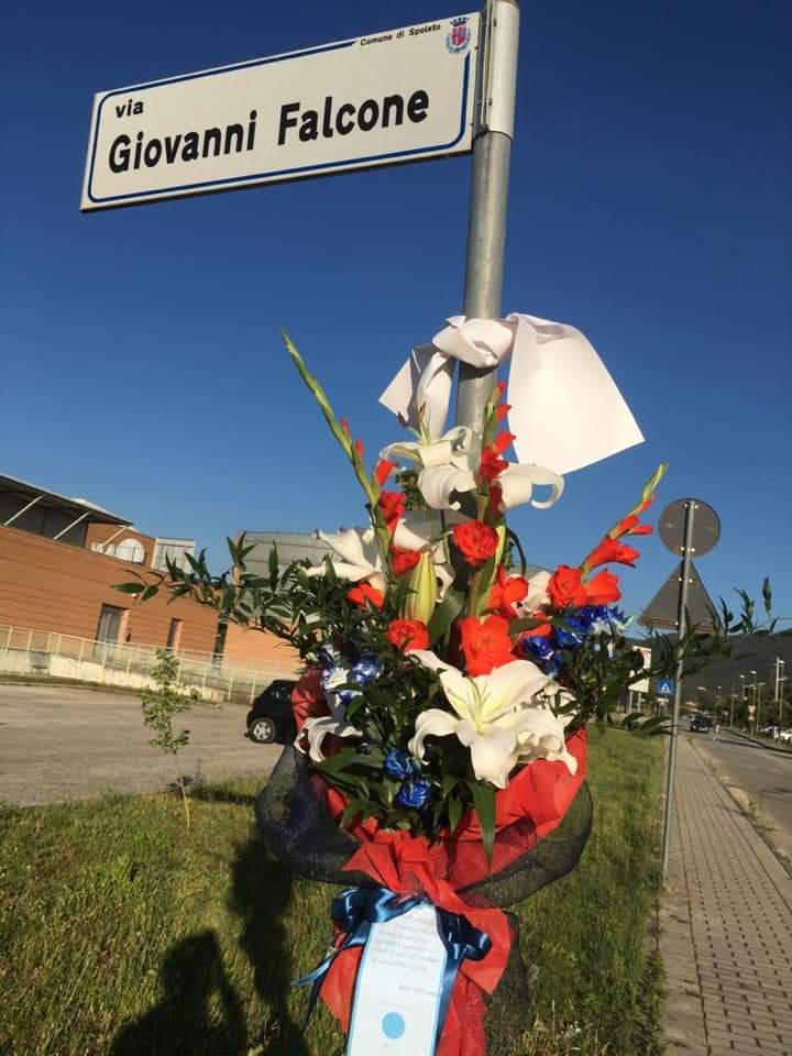 (DMN) Spoleto- Nel pomeriggio di sabato 23 maggio, nel 28° anniversario della strage di Capaci, in cui persero la vita il Giudice antimafia Giovanni Falcone, la moglie Francesca Morvillo e tre agenti della scorta, i membri dell’Associazione Volontari Carabinieri in Congedo di Spoleto, qualità di associazione di cittadini volontari di Protezione Civile, impegnati da anni nel sociale e che statutariamente tra i propri scopri hanno la promozione della Legalità , hanno deposto un mazzo di fiori e appeso una dedica rivolta al giudice nella tabella toponomastica della via dedicata che si trova tra il cantiere della nuova chiesa di San Giovanni Paolo II ed il centro civico e commerciale di San Nicolò. Notte tempo degli ignoti hanno asportato sia i fiori che la dedica.