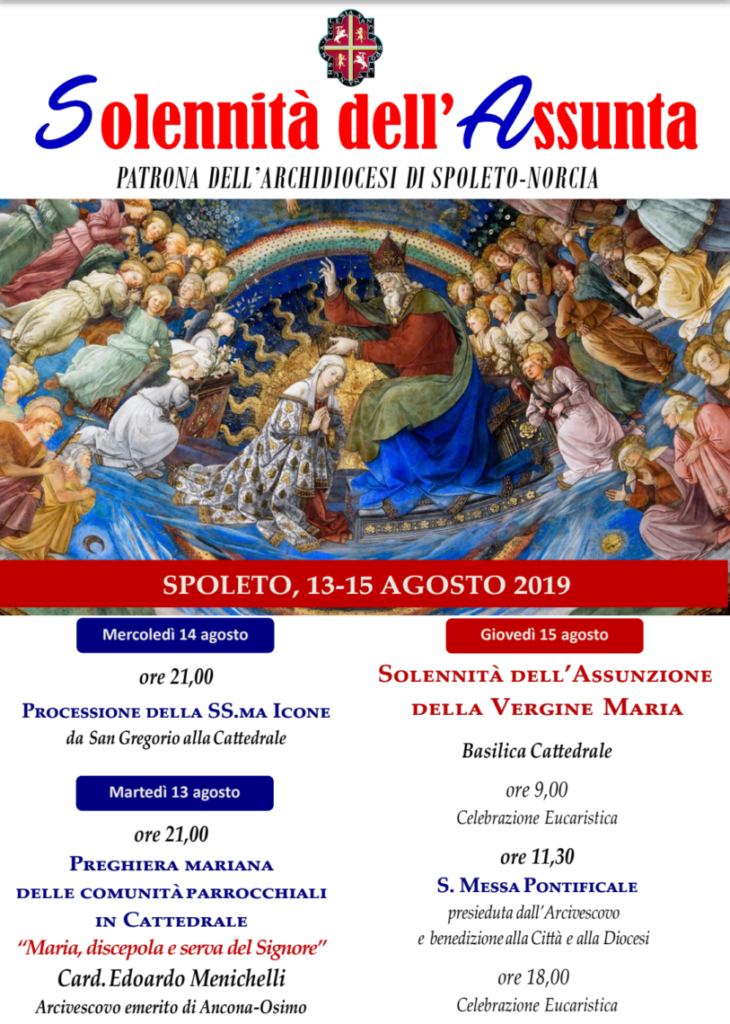 (DMN) Spoleto – Il 15 agosto la Chiesa celebra la solennità dell’Assunzione di Maria. A Spoleto, come di consueto, è festa grande. La Basilica Cattedrale è infatti dedicata all’Assunta; l’Assunta è la patrona principale dell’Archidiocesi insieme a S. Ponziano e S. Benedetto; nel Duomo, poi, è conservata la Santissima Icone (di tipologia bizantina, che raffigura la Vergine Maria