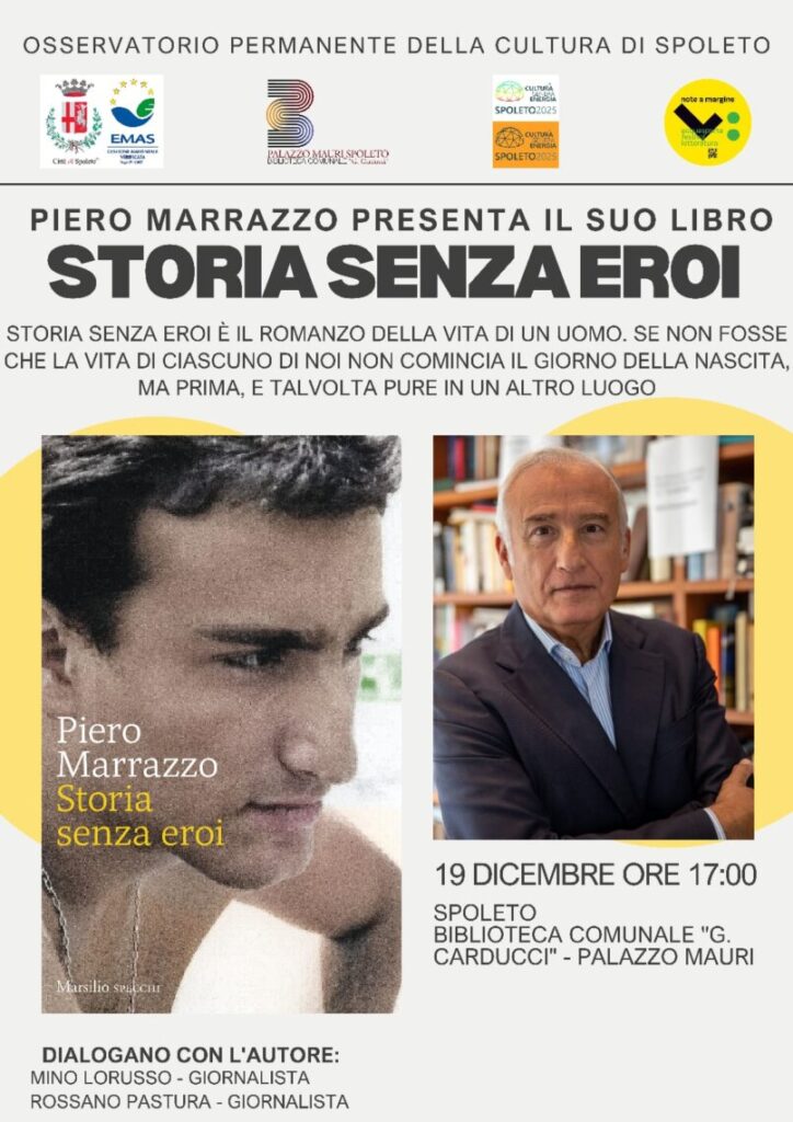Piero Marrazzo sarà a Spoleto, giovedì 19 dicembre (ore 17.00) alla biblioteca “G. Carducci” di Spoleto, per presentare il suo libro “Storia senza eroi” pubblicato da Marsilio. A dialogare con l’autore i giornalisti Mino Lorusso e Rossano Pastura.