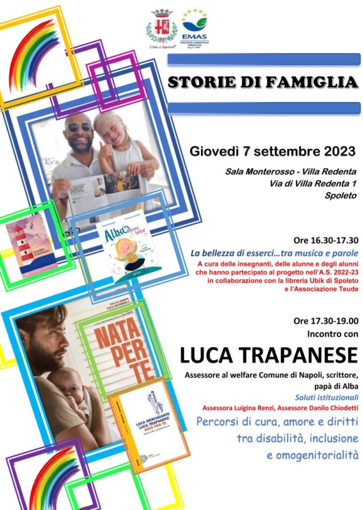 percorso di amore attraverso diritti negati e disabilità – ha dichiarato l’assessore Renzi – insieme a Luca Trapanese, scrittore, papà adottivo di Alba, bambina down che nessuno voleva adottare parleremo dei diritti delle bambine, dei bambini e delle famiglie in senso lato. Oltre a raccontarci la sua esperienza, avremo un momento di incontro con le studentesse e gli studenti di alcune scuole primarie che presenteranno un laboratorio artistico sul libro dell’autore del titolo “Ditemi bella” riferito ad Alba”