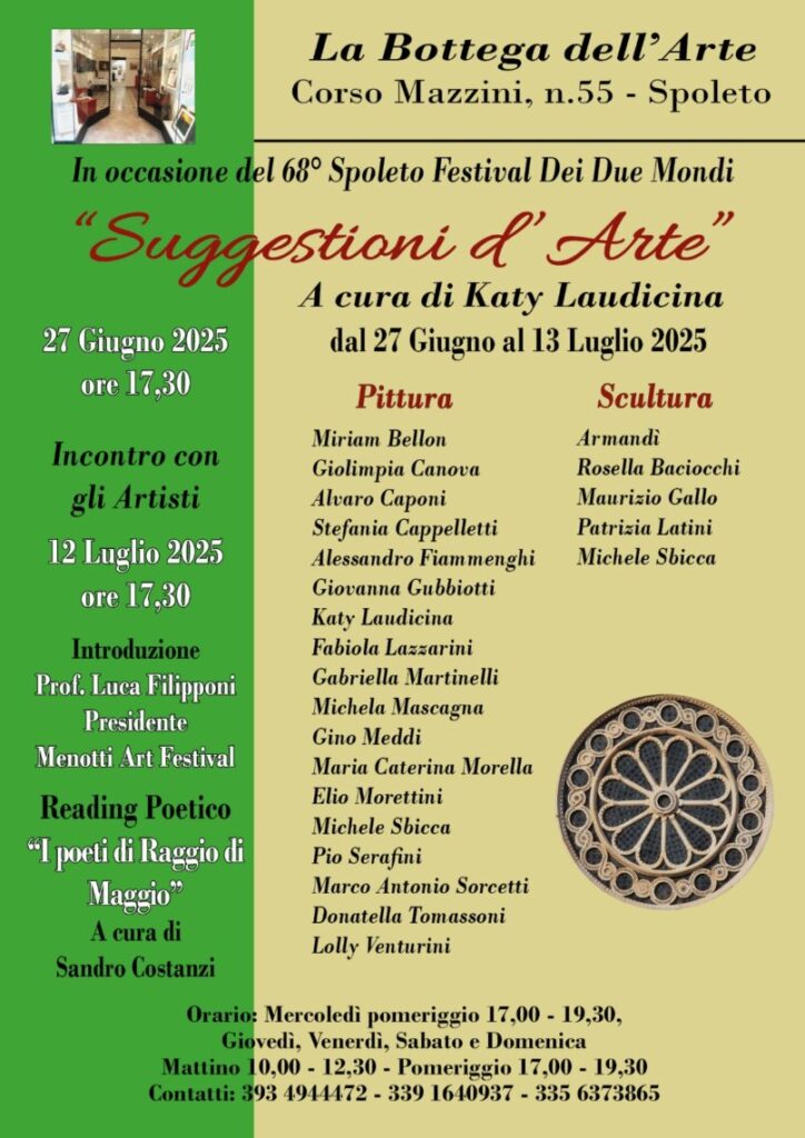 ( R.Be.) – Katy Laudicina, pittrice spoletina di lungo corso, continua nella sua preziosa opera di raccordo tra artisti di estrazione e scuole artistiche diverse. E non poteva mancare, anche quest’anno, la consueta kermesse festivaliera in quella sorta di cenacolo che è diventato “La Bottega dell’arte” al numero 55 del salotto buono di corso Mazzini. La collettiva aprirà i battenti domani, venerdì alle ore 17,30. Ad esporre le proprie opere sono i pittori Mirian Bellon, Giolimpia Canova, Alvaro Caponi, Stefania Cappellettti, Alessandro Fiammenghi, Giovanna Gubbiotti, la stessa Katy Laudicina, Fabiola Lazzarini, Gabriella Martinelli, Michela Mascagna, Gino Meddi, Maria Caterina Morella, Elio Morettini, Michele Sbicca, Pio Serafini, Marco Antonio Sorcetti, Donatella Tomassoni e Lolly Venturini. La sezione scultura ospita, invece, Armandì, Rosella Baciocchi, Maurizio Gallo, Patrizia Latini e Michele Sbicca. Artisti conosciuti dal grande pubblico spoletino e che, altrimenti, sarebbero impossibilitati ad esporre singolarmente le loro opere, visti i costi proibitivi dei locali in concomitanza con la manifestazione festivaliera. Ecco, quindi, la preziosa opera di “mecenatismo” svolta da Katy Laudicina, artista appassionata ed amante della propria città. La kermesse potrà essere visitata mercoledì pomeriggio, e per l’intera giornata di giovedì, venerdì, sabato e domenica. Per visite “extra time” si possono contattare i numeri 393 4944472 e 339 1640937. Il 12 luglio vi sarà un incontro con gli artisti (ore 17,30) introdotto da Luca Filipponi, presidente del Menotti Art Festival cui seguirà un reading poetico.
