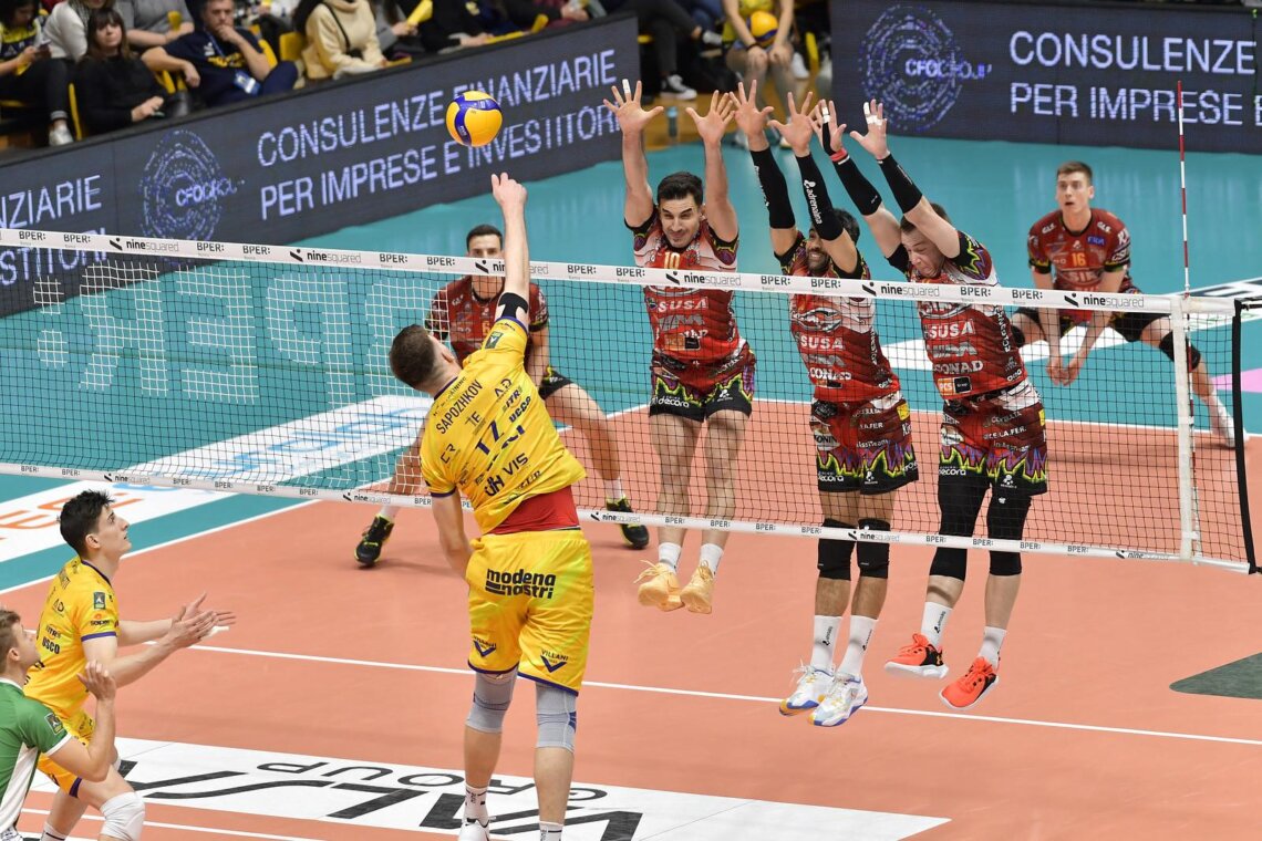 Vantaggio Modena nel secondo set con il doppio ace di Sapozhkov (4-2). Plotnytskyi difende, attacca e pareggia (6-6). Muro di Semeniuk poi ace di Plotnytskyi (6-8). La coppia Giannelli-Russo ferma a muro Juantorena (8-11). Ben Tara è vincente con l’attacco dalla seconda linea (8-13). Fuori l’attacco di Sapozhkov (13-19). Entra Leon, a distanza di quasi tre mesi, al servizio per Solè. Ben Tara e Russo entrambi in contrattacco (14-22). Ben Tara porta i suoi al set point (17-24). Ace di Semeniuk, raddoppio bianconero (17-25).