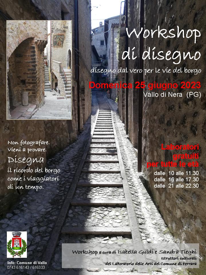 Appuntamento domenica 25 giugno tra i vicoli e le strade del paese-castello della Valnerina per una serie di laboratori gratuiti e giochi per bambini. Nell’intero arco della giornata, Isabella Guidi e Sandra Tieghi istruttrici culturali del Laboratorio delle arti del Comune di Ferrara, insegneranno tecniche e trucchi, accompagnando gli abitanti e i visitatori a realizzare appunti di viaggio, disegnando dal vero scorci dei luoghi su un taccuino, proprio come i viaggiatori di un tempo. Un invito a non fotografare ma a disegnare il ricordo di un panorama, di un raggio di luce, di un passaggio tra le case. I libretti rimarranno ai partecipanti ai quali verrà fornito anche l’occorrente per disegnare. I laboratori sono gratuiti, dureranno un’ora e mezzo ciascuno e saranno svolti in tre fasce orarie: