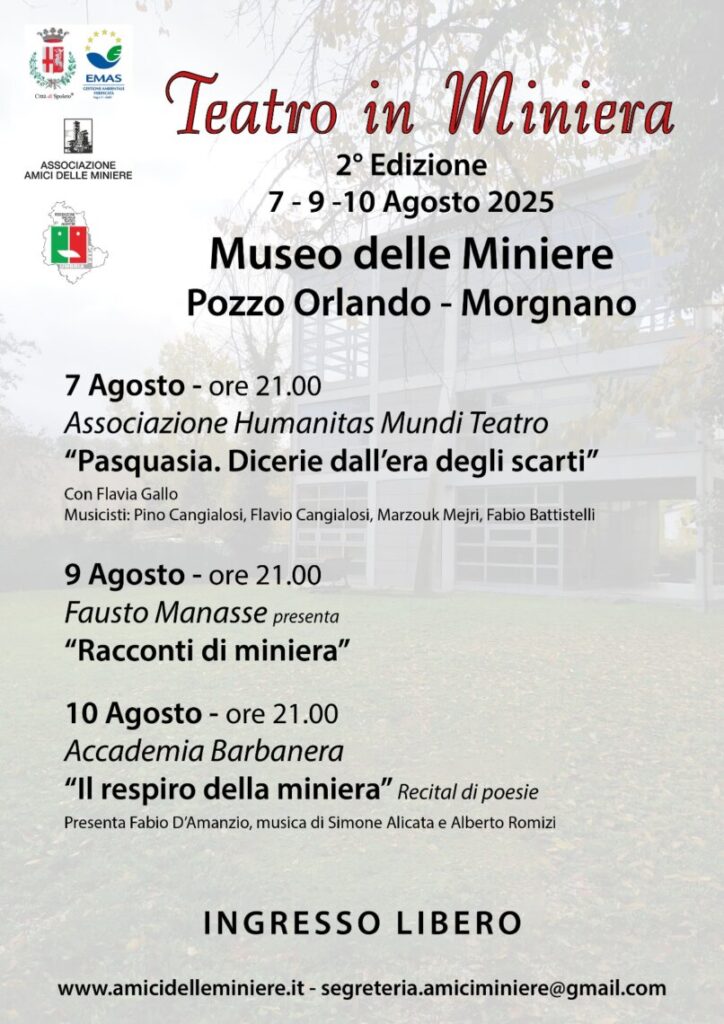 Dopo il successo della prima edizione, torna “Teatro in miniera”, la rassegna teatrale organizzata dall’Associazione Amici delle Miniere e dalla Federazione Italiana Teatro Amatori (FITA), che propone a Morgnano nel giardino del Museo di Pozzo Orlando spettacoli teatrali incentrati sul tema delle miniere.