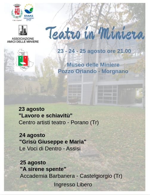 Dal 23 al 25 agosto, infatti, il giardino del Museo ospiterà la prima edizione della rassegna teatrale “Teatro in Miniera” che, inserita in “Accade d’estate a Spoleto 2024” il ciclo di manifestazioni organizzate dal Comune di Spoleto insieme alle associazioni del territorio, è nata dalla collaborazione tra l’Associazione “Amici delle Miniere” di Spoleto e la Federazione Italiana Teatro Amatori, FITA– Comitato regionale Umbria.