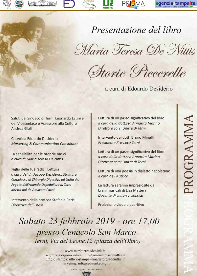Il 23 febbraio alle ore 17,00 nella chiesa sconsacrata Cenacolo San Marco che, all’interno custodisce antichi affreschi (Crocifissione, Madonna della Misericordia, immagini di Santi, databili tra 1464 – 1468 e la Madonna col Bambino al cinquecentesco Altare maggiore, di Bartolomeo da Miranda), sede storica dal 1975 per eventi dell’Associazione culturale ISTESS e del Festival Popoli e Religioni, che già in passato ha ospitato Maria Teresa De Nittis con le sue opere, si terrà la presentazione del nuovo libro dell’artista dal titolo Storie Piccerelle, curato da Edoardo Desiderio.