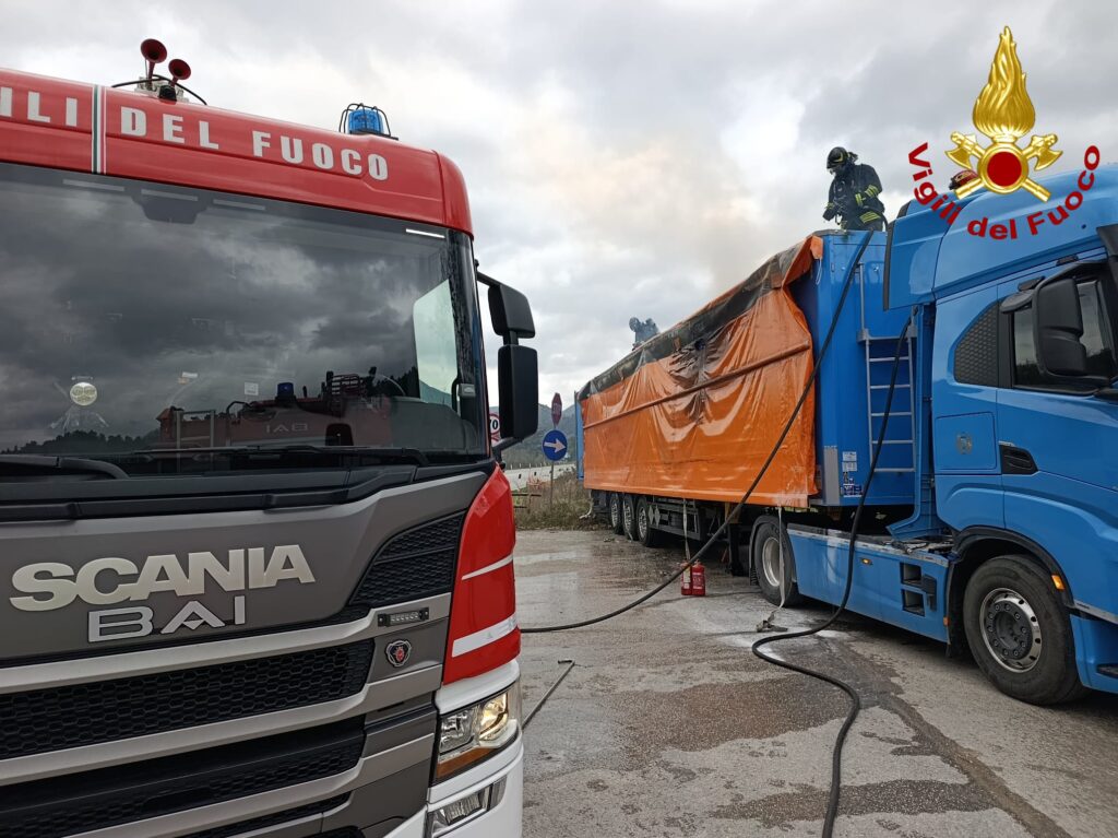 Incendio nella giornata di oggi alle porte di Spoleto, poco prima della zona di Testaccio, lungo la Statale 3 Faminia, dove ha preso fuoco il rimorchio di un TIR fermatosi in un piazzale.