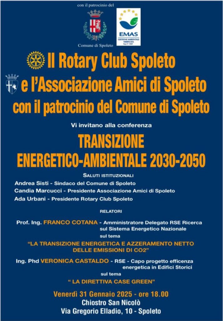 Venerdì 31 gennaio 2025 alle ore 18 a Spoleto nel complesso monumentale di San Nicolò si tiene la conferenza dal titolo: “Transizione energetico-ambientale 2030-2050” a cura del Rotary Club di Spoleto e dell’Associazione Amici di Spoleto onlus con il patrocinio del Comune di Spoleto. L’evento è rivolto a tutta la cittadinanza e al comprensorio.