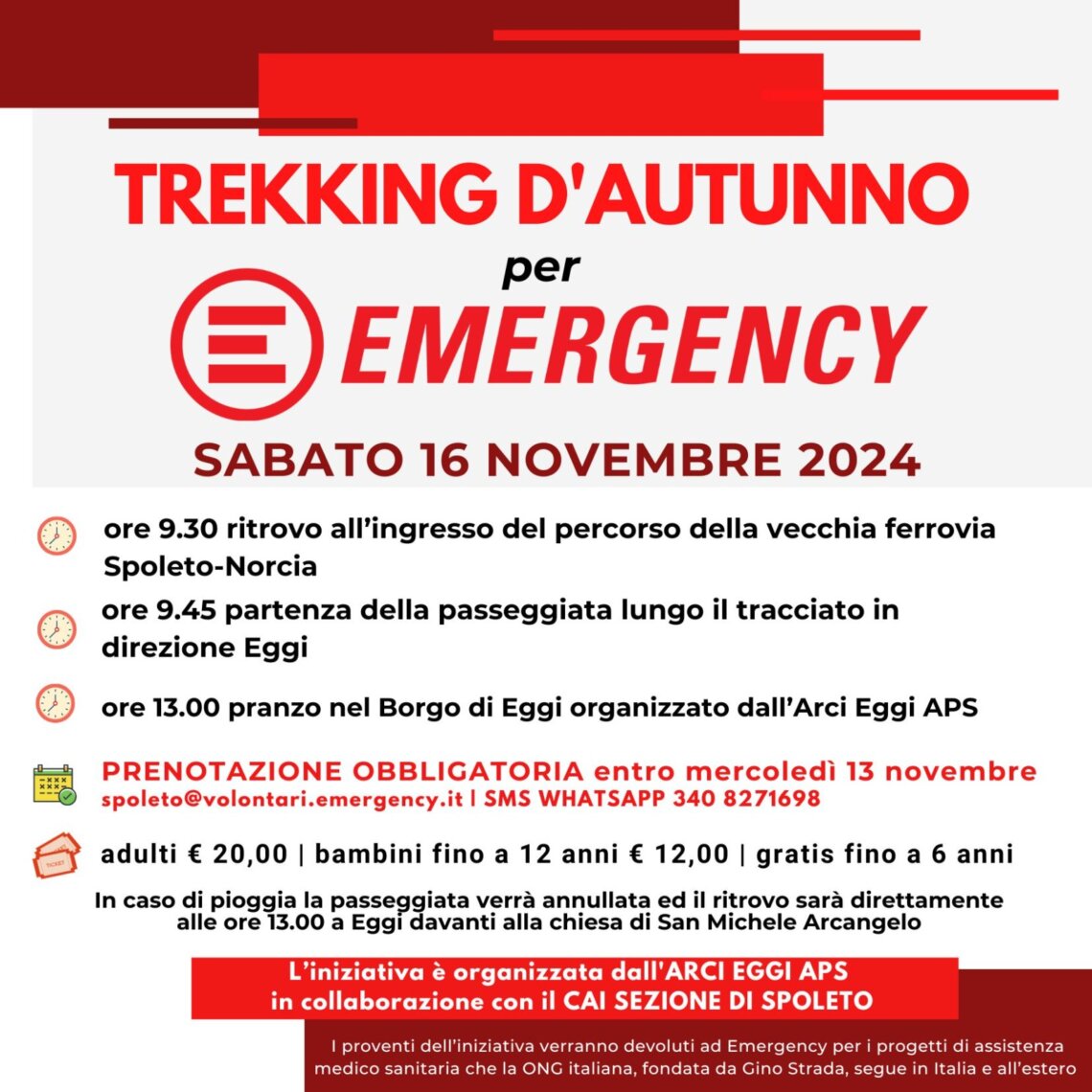 Nuova iniziativa a Spoleto a sostegno di Emergency. Sabato 16 novembre è in programma il “Trekking d’Autunno per Emergency” organizzato dall’Arci Eggi APS in collaborazione con il CAI sezione di Spoleto. Si tratta di una passeggiata aperta a tutti, papà, mamme, bambini e bambine, giovani e meno giovani, un’occasione per partecipare tutti insieme ad un’iniziativa benefica.